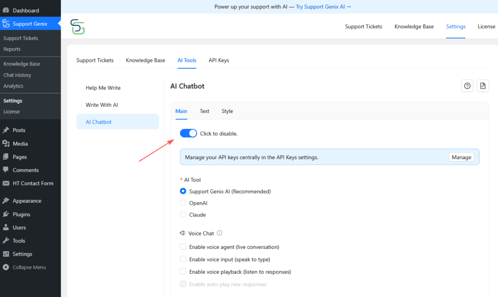 Voice Chat in Support Genix allows customers to communicate with your AI chatbot using natural voice interactions. Instead of typing messages, users can speak directly and listen to AI-generated responses, creating a faster, more human-like support experience.
