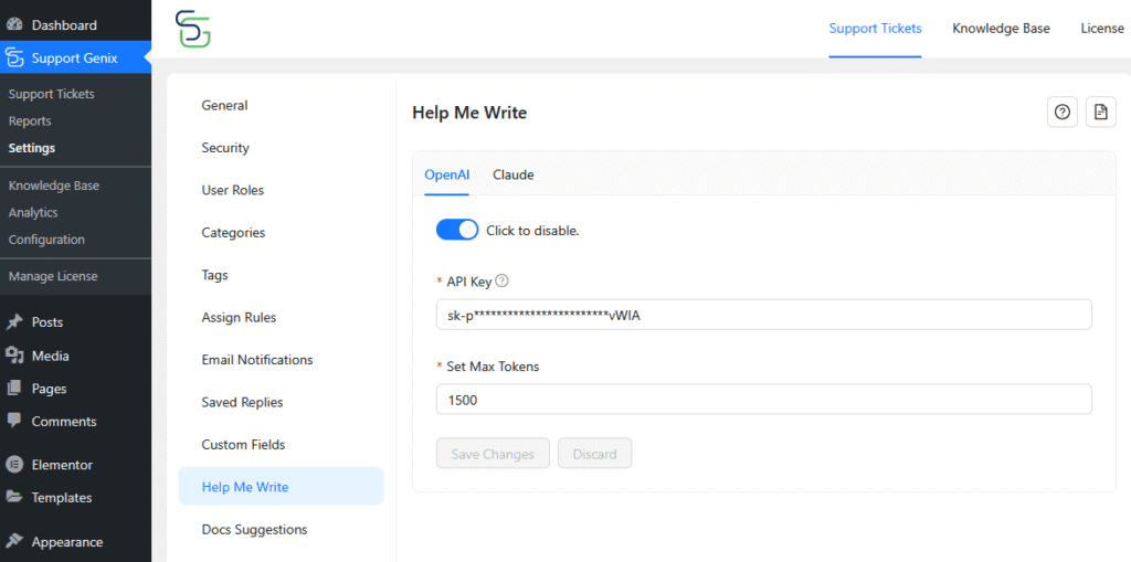 - Go to Support Genix → Settings → Help Me Write