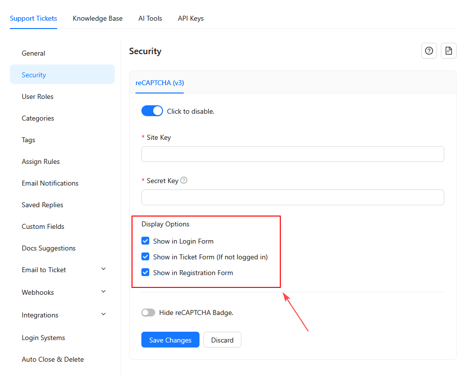 This is the central place to manage all reCAPTCHA-related settings in SupportGenix.