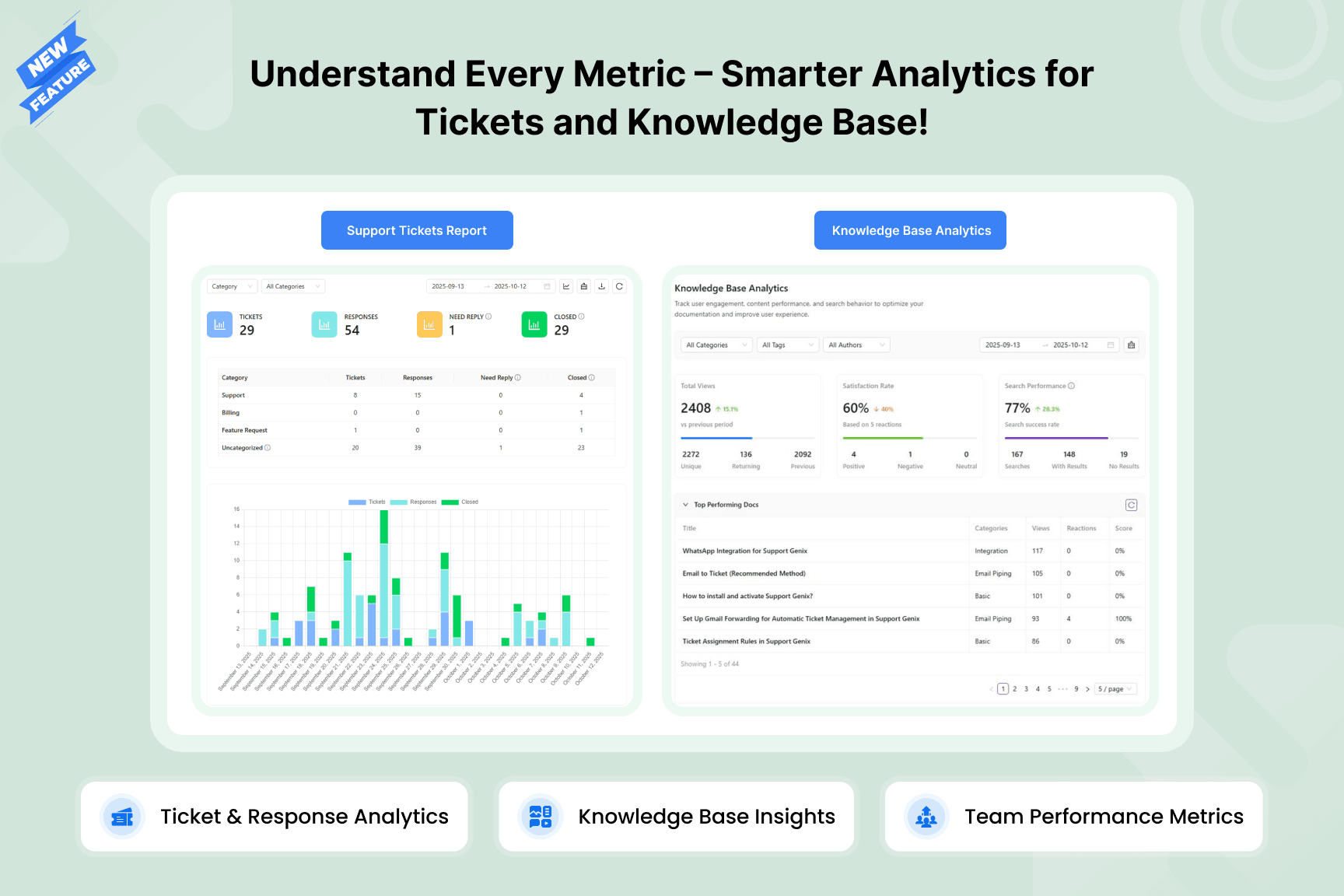 Support Genix Pro provides comprehensive analytics through intuitive visual dashboards. You can generate detailed reports filtered by date ranges and categories to track key metrics including total tickets, responses, tickets needing reply, and closed tickets. The reporting system breaks down performance by support categories (Support, Feature Request, Billing, etc.) and displays daily activity through interactive charts. These insights help identify peak support periods, measure team responsiveness, and optimize your customer service operations for maximum efficiency.